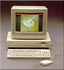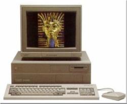 AMIGA 2000 | Das rechte Foto zeigt > als nächstes Beispiel einen Amiga 1000, welcher etwa in Mitte der 80´ger Jahre gefertigt wurde. Amiga hatte derzeit schon ein vollständiges, eigenes und stabiles Betriebssystem. Auch erste Speicher- medien, wie RAM (sogenannte SIMMs) und Festplatten bis ca. 120MB wurden zum Teil schon mit eingebaut. Diese Systeme waren seiner Zeit schon weit voraus. < Man glänzte schon mit grafischen Möglich- keiten und 8 BIt Sound. Sie können ein Beispiel hören, wenn Sie auf die Grafik (Amiga 2000) klicken. |